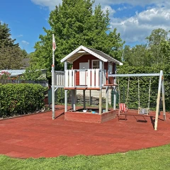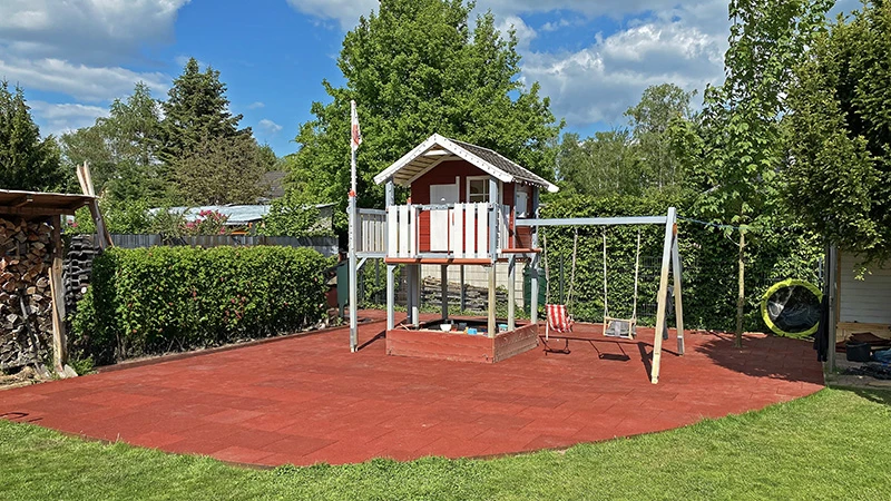 Witterungsbeständig und langlebig: Fallschutzplatten aus Gummigranulat verrotten nicht, werden nicht weggespielt oder weggeweht. Die Fläche kann viele Jahre genutzt werden.