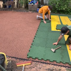 Die Fliesen sind schnell und einfach zu verlegen. - Ist optimal für einen Spielplatz geeignet. Der Boden wirkt wärmeisolierend und bieten guten Fallschutz. Auch das Befahren mit einem PKW ist kein Problem.
