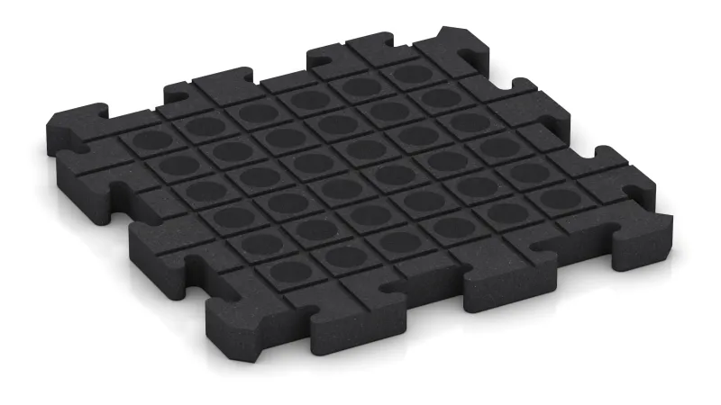 Fitnessgulvspladerne presses af gummigranulat og bindemiddel i præcise forme, hvor puslesamlingen med let afrundet fas dannes. Denne konstruktion sikrer et formsluttende, stabilt gulvtæppe og et diskret, ordnet fugebillede.